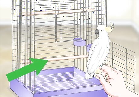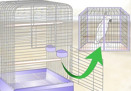 Set up the cockatoo in a temporary cage. Before you do the weekly cleaning, transfer the cockatoo to a temporary cage with a door. Use a spare cockatoo cage. Make sure the cockatoo is safe to stay in the cage for 30 minutes to an hour while you clean the regular cage. You can also put a spare set of food and water dishes in the cage so the cockatoo has somewhere to eat and drink.