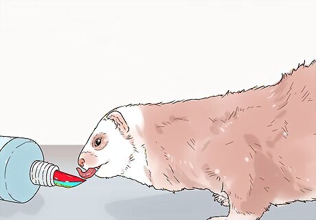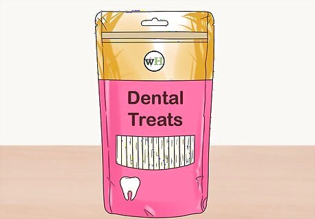 Give your ferret toothbrushing treats. In addition to manual brushing, you can offer your ferret treats that will help keep its teeth clean. They'll most likely be labelled for dogs or cats, but it's fine to give them to your ferret. You can find dental treats at your local pet supply store. Toothbrushing treats aren't a substitute for regular manual brushing.