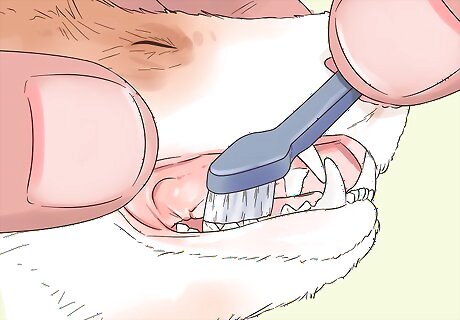 Brush gently and start with short sessions. Lift your ferret's lips and try to lightly brush each tooth with circular motions. Pay special attention to the outsides of the teeth, which is where the most plaque builds. Limit your first brushing sessions to around 30 seconds. Do your best to get all the way to the back teeth. If your ferret gets upset, give it a break and try again later.