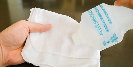 Apply rubbing alcohol if there is an ink stain. Dip a cotton swab or cloth in rubbing alcohol and dab the stain. Only put the alcohol directly on the spot, so you don’t spread the stain to the rest of the leather. Hand sanitizer or hair spray will often work instead of rubbing alcohol. Test the alcohol on a very small spot of the leather first. There's a chance it could remove the color of the leather.