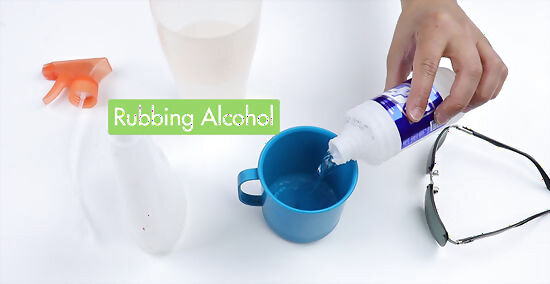 Combine some rubbing alcohol and water. Using rubbing alcohol is a safe way to clean glasses without removing finishes, such as non-glare coatings. Put three parts alcohol for every one part of water you mix together. Make as much as desired, and keep in a small spray bottle for future uses. Spray and wipe with a clean cotton cloth in a circular motion.