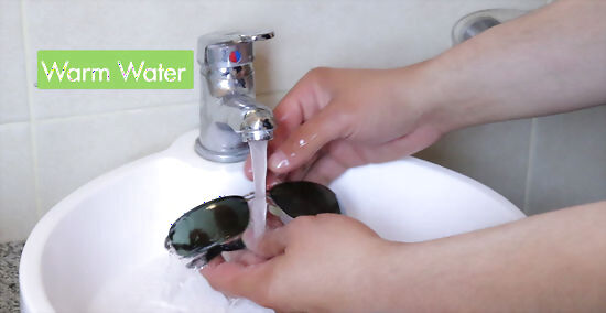 Run lenses underneath warm water. Make sure the water is at a warm enough temperature to touch — tepid or room-temperature water is ideal. Running glasses under water that is too hot could damage any coatings the lenses may have.