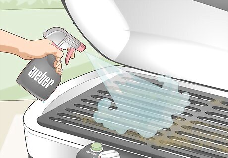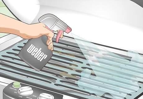Spray down the grill grates with Weber’s cleaning product. Twist the nozzle on your spray bottle so it reads in the “on” position. Next, spritz the product heavily over the surface of the cooled grates. Don’t worry about applying too much spray—the formula is designed specifically for Weber grills, and works well in large amounts. Try to drench the grates completely with spray. You can even use Goo Gone Grill and Grate Cleaner. Keep the grates on the grill when you spray it down.Tip: If you don’t have the Weber cleaning spray on hand, you can let the grates soak in hot water. Next, use mild dish soap and an abrasive pad to clean them off. Once you’ve rinsed off the grates and dried them off with a paper towel, leave them in an open area for several hours so they can air-dry.