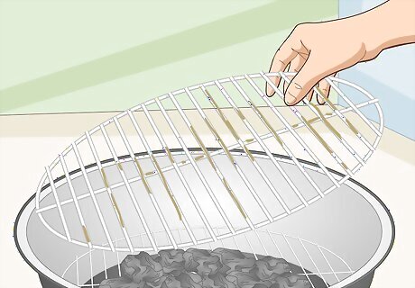 Remove the grate from the charcoal grill. Use your fingers to pull the circular grate from the surface of the grill. After you’ve lifted the item away from the grill, transfer it to a flat surface, like a table. Place the grate on a surface that you don’t mind getting dirty. If you’re working outside, consider using a portable pull-up table.