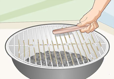 Brush down your grill grates with a steel brush. Take a steel-bristled tool and scrub down your grates in long, vertical motions. Try to work from left to right, so you can cover the entire surface of the grill grates. As you work, watch for ash falling from the grates to the bottom of the appliance. Try to brush off as much of the burnt residue as you can. To prevent rust, consider preheating and brushing off your grates each time you grill something.