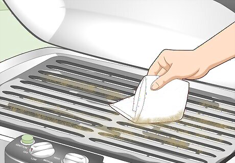 Wipe off any excess cleaner with a moist paper towel. Soak a paper towel or rag beneath cool tap water, then wring it out completely. With this damp towel, wipe down the grill in slow, vertical motions. Work from the back of the grill the front so you can pick up any extra grease. Don’t be discouraged if there’s still leftover grease on the grill! It might take a few rounds of cleaning before you notice any results.