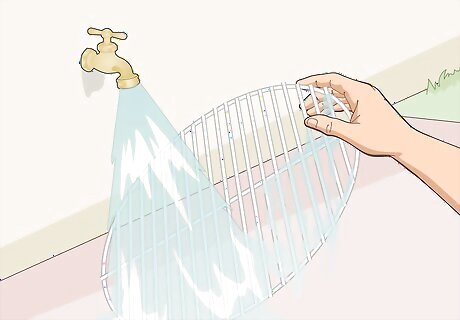 Rinse off the grate with clean water. Using a faucet, hose, or damp paper towel, clear off any remaining suds or soapy water from the grate. Continue rinsing the each grate opening until the item completely soap-free.