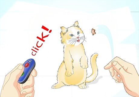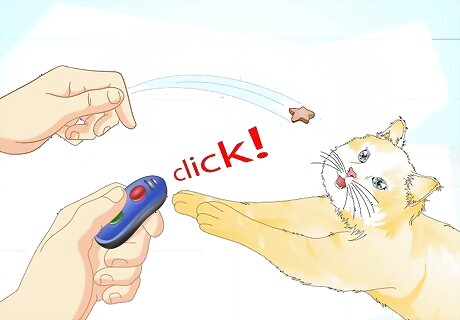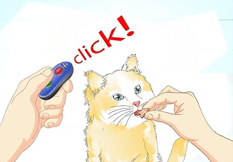 Use the clicker and give a reward. Toss over a treat for your cat while making the clicking noise at the same time. This will begin an association in the cat’s mind that a clicking sound will mean a treat will appear. Don't click at any other time. You want the cat to associate the click with the treat, so don’t click while the cat is eating, looking at you, or walking away. Only click when you give the treat.