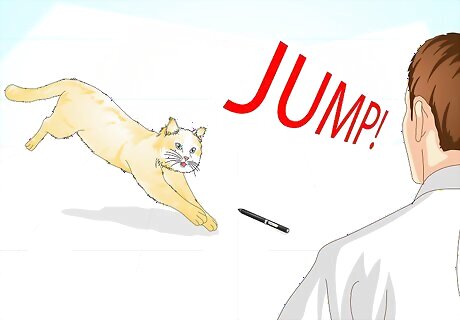 Decide on a verbal cue for each of your cat's tricks. While the clicker noise is good for letting the cat know what it's doing right, verbal cues can be used once the cat has already learned a few tricks, to help it understand which trick you want it to do. The verbal cue must be distinct and clear. It should be a word you won't use with other pets, or a word that is used too much in everyday conversation. Choose a logical word to make your cat do something. You might use “Jump!” for when your cat jumps onto something. You might use “Come!” for when your cat walks toward you.