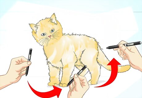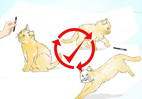Move the target around. Now you can start to move the target so that your cat will also move. Encourage your cat to take a step toward the target. Once the cat is reliably looking at target every time you introduce it, try to get the cat to take a step in its direction. As soon as it takes that step, click and reward. Try moving the target over to the side. When your cat follows the target, click and give a reward. Taking an incremental approach will be productive, because cats won’t complete the entire action you want the first time. Give rewards when your cat makes partial movements in the right direction. As you keep training, you reward him for getting closer and closer to the complete action.