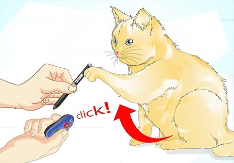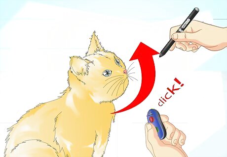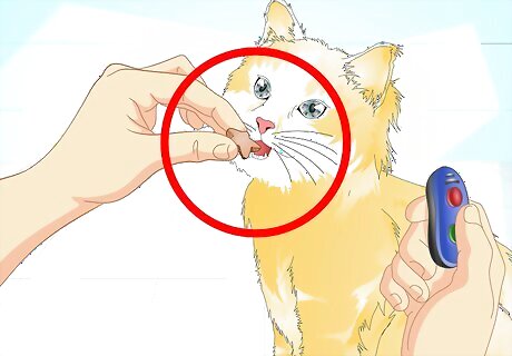 Reinforce the click/treat relationship briefly. In the beginning, every time you start a new training session, reinforce the click/treat relationship by clicking the clicker and giving your cat a treat. This will remind your cat of this association.