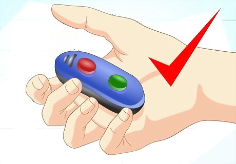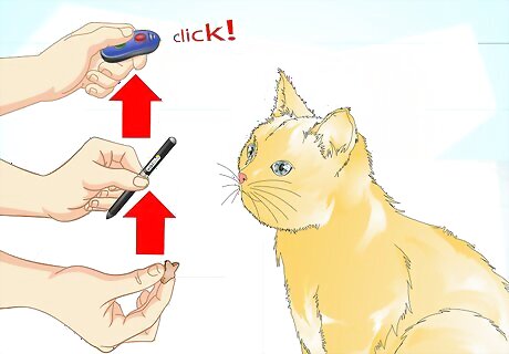 Get a clicker. A clicker is a small plastic box with a metal tab in it. When you press it, it makes a clicking sound. These are available online or in pet stores, and they cost as little as $1. These are commonly used to train dogs and cats. It's best to use a clicker specifically designed for training. If you don't have one, though, make a distinct clicking noise with your mouth, or you can use a pen that makes a clicking sound. If your cat is deaf, you can use a pen light to achieve the same results.