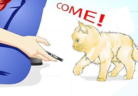 Teach your cat to come. Sit on the floor and hold out the target. If your cat will respond to the target by walking toward it, try holding it in front of you and say, “Come!” at the same time. When your cat moves towards the target (and you), click and give a reward. Try this several times in different locations in your house. Make sure you click and reward each time. If your cat is just not getting it, or if he seems confused, revert back to your previous training. End the session on a good note and try again later. Remember to only try these sessions for about 5 minutes at a time.