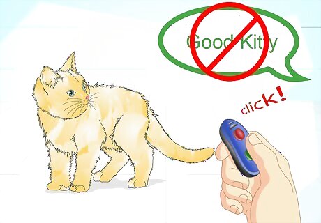 Don’t talk to your cat during this time. Don't talk to the cat or use any kind of verbal cues during this first stage. You want the clicker noise to be the clearest signal here. The click noise is also much easier for an animal to identify than a verbal cue, such as saying, “Good kitty.” Your timing might not be as exact, and the cat might pick up on your tone differently every time. A click is quick and consistent.