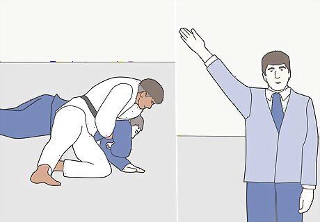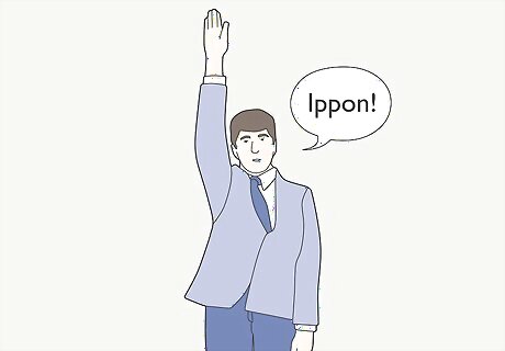 Score an ippon, which is a full point, to immediately end the match. Ippon can be earned by getting your opponent to say maitta (I give up), or keeping your opponent restrained for 25 seconds after the referee calls osaekomi. To score ippon on a throw you must fulfill three elements: be in control, as you throw your opponent on their back, all with considerable force and speed. Osaekomi is announced when a contestant controls an opponent by getting their back, both shoulders, or one shoulder in contact with the mat. Two waza-ari’s, or one waza-ari and three minor penalties for the opponent, are also equivalent to ippon. A waza-ari is a half point.