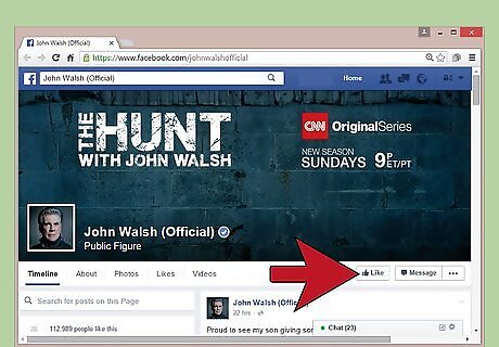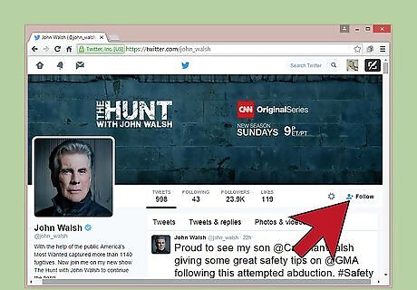 Follow him on Facebook. John Walsh provides updates and alerts about missing persons and fugitives on his official Facebook page. If you wish to stay abreast of the latest news or think you may have a need to contact him in the near future, follow him on Facebook. Log on to Facebook and type “John Walsh Official” in the search bar at the top of the website. Hit enter. Under the heading “Pages” you will see a picture of Walsh and the name of his page “John Walsh (Official)” in bold. Click on the image or the title of his page. Locate the banner at the top of his Facebook page. In the lower right corner of the banner, find the button that says “Like.” Click on the button. Your newsfeed will now include Walsh's latest posts.