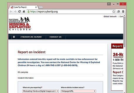 File a report with the CyberTipline. In addition to its 24-hour hotline, the NCMEC also has an online form for reporting relevant tips. The online form is used exclusively to submit information regarding exploited children. If you have a possible lead or tip regarding the sexual exploitation of a child or children, you can report that tip using the center's cybertipline. Type “NCMEC CyberTipline” into the search bar of your web browser and press “Enter” or click “Search.” Click on the entry titled: CyberTipline of the National Center for Missing and Exploited Children.” The information you are required to fill out is dependent upon the type of crime you are reporting. Do your best to fill in all of the required fields. When you have finished filling out the form, click “Submit.” Your tip will be passed along to the proper authorities after you submit it.