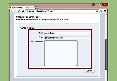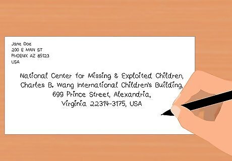 Write or fax a letter. If you do not have an urgent tip, consider mailing or faxing a letter to the NCMEC. Your letter may include general questions, comments, or praise. You can address your comments specifically to John Walsh, but he may or may not read them. Address your letter to: National Center for Missing & Exploited Children, Charles B. Wang International Children's Building, 699 Prince Street, Alexandria, Virginia 22314-3175, USA. Fax your letter to: 1-703-224-2122. The fax line is not open 24 hours a day or seven days a week. Any information you send will not be received until normal business hours.