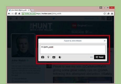 Tweet at Walsh. The best way to contact Walsh directly on Twitter is to Tweet at him. You may also reply to one of his Tweets. You may only send Walsh a direct message if he is one of your followers. Tweet at him. Locate and click the “Tweet” button at the top right corner of your screen or find the Tweet text box at the top of your Twitter Home timeline. Type your Tweet, which must be 140 characters or less, into the text box and include Walsh's Twitter handle, “@john_walsh.” Once complete, click the “Tweet” button to send it. Reply to his Tweet. Scroll through Walsh's Tweets until you find one of interest to you. Locate and click on the small left-pointing arrow directly under the content of the Tweet. A Tweet box will automatically pop up on your screen. It will contain the appropriate Twitter handles for the reply. Use your remaining characters to reply to Walsh's tweet. Once finished, click the “Tweet” button to send it.
