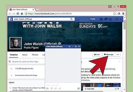 Send Walsh a private message via Facebook. If the content of your message is of a personal nature or you wish to contact Walsh directly, you may send him a private message through Facebook. Facebook is the only social media platform that allows you to contact Walsh directly. Remember, however, that he may or may not respond. Locate the banner at the top of his Facebook page. In the lower right corner of the banner, find the button that says “Message” and click on the button. A direct message window will appear. Type your private message into the active text box. When you have finished typing, press the “Enter” key on your keyboard or the “Send” button on your tablet or phone screen to send the message.