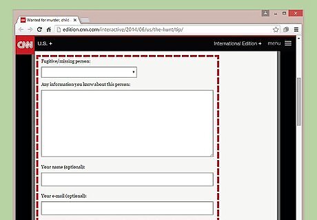 Report a tip online. Instead of calling in a tip, you may submit your information about fugitives or missing persons through an online form. You may only leave tips that pertain to fugitives or missing persons showcased on “The Hunt with John Walsh.” You may find the form through his show's site. Type “The Hunt with John Walsh” in your web browser's search bar. Click on the result that contains “CNN” in the title and web address. Locate and click on the graphic that is titled “Got a Tip?” You will automatically be redirected to a form. Locate the section titled: “Fugitive/missing person.” Select the fugitive or missing person your tip pertains to from a drop-down menu. Locate the section labeled: “Any information you know about this person.” Type any pertinent information into the text box. Find the section titled: “Your name (optional).” If you would like to leave your name, type it into the text box; if you wish to leave an anonymous tip, skip this step. Find the section titled: “Your email (optional).” If you would like to leave your email address, type it into the text box; if you wish to leave an anonymous tip, skip this step. Scroll all the way to the bottom of the page and locate the “Submit” button. Click on the “Submit” button to send in your form.