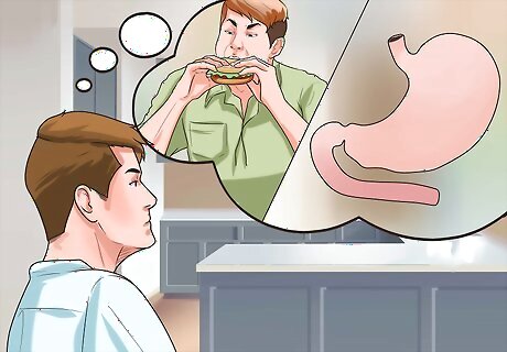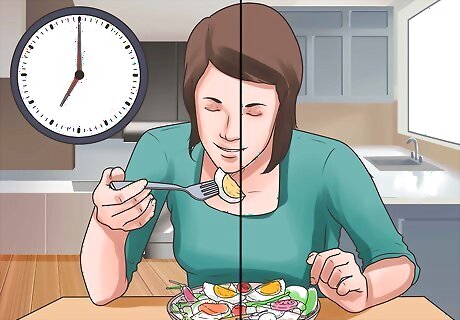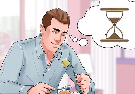 Slow down. Binge eating involves consuming food very quickly. Slowing down and taking time to focus on the food itself, however, (how it tastes, temperature, etc.) can sometimes help calm the craving to overeat. This type of mindful eating has become a well-known technique for easing over consumption, touted by physicians, celebrities and chefs alike. Don't eat while standing up or in the car or when you're trying to do something else. Sit down for your meals. Try to avoid situations in which you feel you must "scarf down" your food. Stop and put your fork down between each bite. Fully chew your food and swallow before picking up your fork again. Allow yourself to feel the texture of the food and notice its flavor and smell.