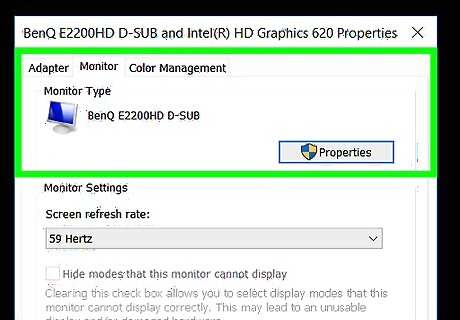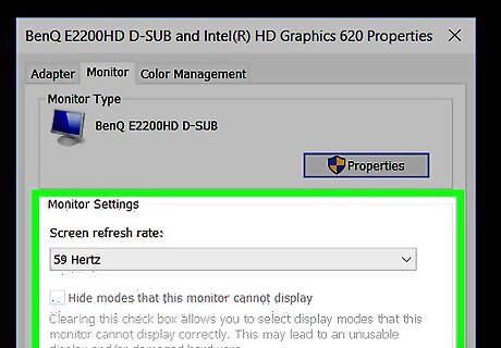 Change the refresh rate. Go into Advanced Settings > Monitor tab, and then choose the correct refresh rate to match the monitor’s default. Click OK, and the advanced settings box will disappear. Click Apply, then OK. Most LCD monitors have a refresh rate of 60Hz, but 75Hz tends to produce less flicker. For CRT monitors, you generally want to increase the refresh rate as you go with a higher resolution.