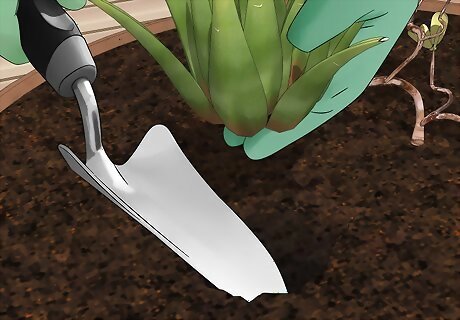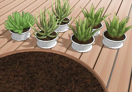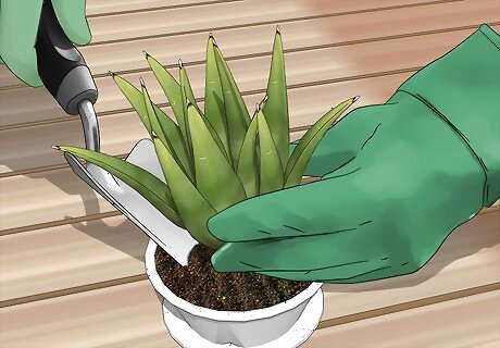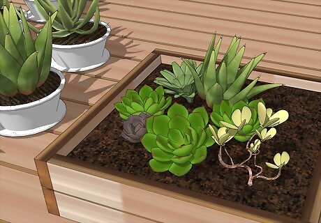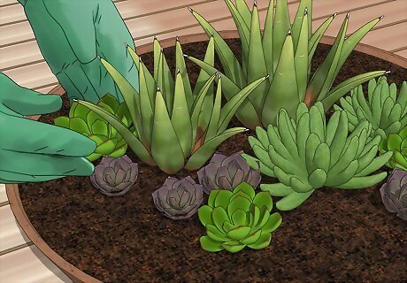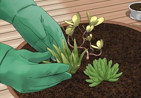 Remove the plants from the pots that you purchased them in. Use a knife or other thin, sharp object to loosen the soil around the edges if necessary. Turn the pots upside down carefully over your hand and gently slide out each plant. Water the plants before you remove them from their pots to make them easier to remove and help keep their root structure intact. Wear gloves if you are handling any prickly plants, such as cacti.