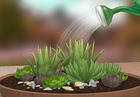 Dig small holes in the soil to fit the root system of each plant. Scoop out just enough soil under each plant to accommodate the root systems. Place the plants in the holes so they are more or less even with the top of the soil in the dish. Normally, you would want to loosen the root system at this point when repotting plants to encourage growth. However, you don’t want the plants in your dish garden to grow too fast and outgrow the garden, so it’s best to leave the roots alone. You can angle plants slightly out around the edges if you don’t want them all to grow straight up.