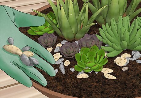 Put a layer of mulch, pebbles, or other finishing touches on top of the soil. Other options include moss, bark, or glass chips. Add accent pieces such as miniature sculptures to create a truly unique garden. This step is not necessary, but will make your dish garden that much more interesting! For example, you could try combining moss with some miniature garden gnome figurines to create a miniature magical landscape.