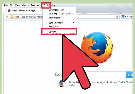 Click on “Tools.” This is found in the Menu toolbar in the upper right portion of the window. Select “Options” from the list. For newer versions of Firefox, click the Menu button on the upper-right corner of the screen and select “Options” from the menu list.