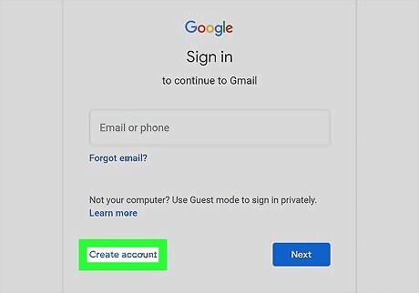 Find where to sign up. Usually, there is a small link image or text that says Register, Sign up, or Create an account, although you may have to go to the login page to find this. Yahoo: Click the envelope icon in the upper right corner, then click Create an account. Gmail: Click Create an account in the upper right corner. Outlook: Click Create free account in the middle of the homepage.