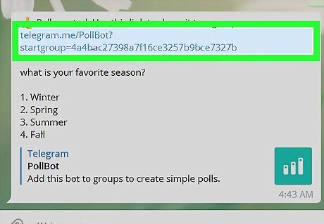Share the link with Telegram users. Copy the URL by highlighting it and pressing Ctrl+C (Windows) or ⌘ Cmd+C (macOS). Then, paste it into conversations and groups by pressing Ctrl+V (Windows) or ⌘ Cmd+V (macOS). Users can now cast their votes.