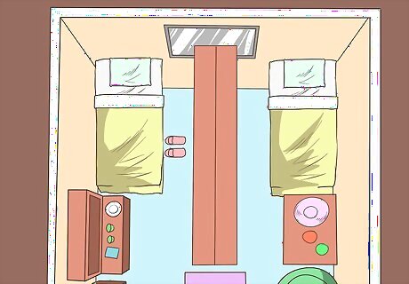 Arrange the room for privacy. While dorm rooms usually aren’t very large, there are ways to arrange the furniture so you and your roommates each have some privacy. If you’re sharing the room with only one roommate, you can each take a side of the room to set up your space. If you’re sharing the room with three or four roommates, you can each take a corner of the room for your furniture. In a two-person dorm room, you might use the room’s furniture to divide the space. Place the dressers, closets, or bookcases side by side in the center of the room, with yours facing your side of the room and your roommate’s facing theirs. That will create a barrier that gives you each a little more privacy. Check to see if your school will loft your bed for you. By lofting your bed, you can create a space beneath that you can put your desk or create a seating area where you’ll have a little more privacy. In a two person dorm room, having one person loft their bed and place their desk beneath it, and the other leave their bed on the floor, with their desk overlooking it, allows you to keep different sleeping and studying schedules without disturbing one another.