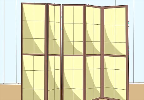 Set up a folding screen. When you may want a little more privacy than your dorm room’s layout allows, a folding screen is an ideal solution. You simply place it in front of your side of the room to give yourself some private time. Because it folds up, though, you don’t have to leave it out all the time, so you can still be social with your roommates when you’re in the mood. A folding screen works especially well if you’ve lofted your bed and created a study or sitting area beneath it. Open the screen in front of the area, and it’s almost as if you have your own private room. You can find folding screens or room dividers at stores such as Target or Walmart. If you’re on a budget, you can even make your own with old shutters and hinges.