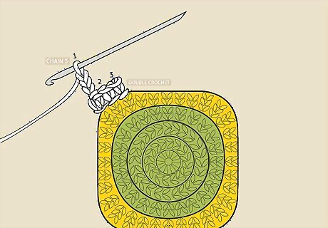 Chain 1 and double crochet 3 times into the edge space. Work into the chain 3 space on the flat edge of your granny square. Chain 1 to provide yourself enough slack to get to the space. Then, double crochet into this space 3 times. Chain 1 again to provide enough slack to get to the next chain 3 space. Work this sequence into each of the chain 3 spaces on the sides of the granny square. Repeat the sequence all the way around the square. Finish the square in the same way you finished the previous rounds with a slipstitch to connect the first and last stitches.