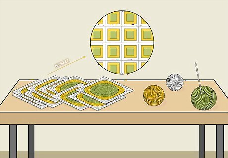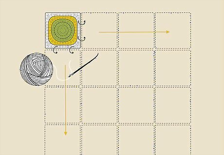 Make additional squares for a multi-square blanket. Create as many squares as needed for the desired dimensions of your blanket. Measure the first square to find the dimensions and use this information to help you determine how many granny squares to make. For example, if you want your blanket to measure 45 by 60 in (110 by 150 cm), and each square measures 5 by 5 in (13 by 13 cm), then you will need 9 rows of 12 squares each, which is a total of 108 squares.