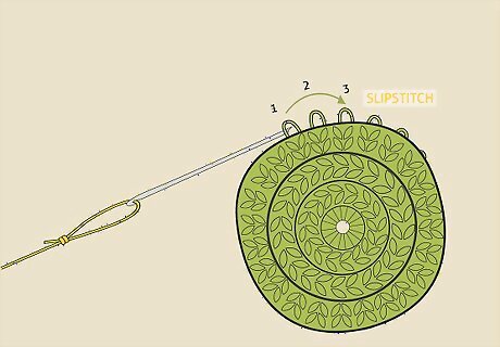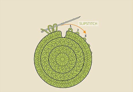 Slipstitch into the top of the first chain of 3. This should be located right next to where you made the last chain of 3. Insert the hook into the top chain in the chain of 3, yarn over, and pull through to secure the first and last chains in the round.