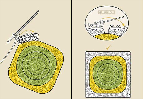 Insert the hook through 1 of the chain 3 spaces and slipstitch. Choose a chain 3 space in 1 of the corners of the square. Slipstitch to connect the new yarn to a chain 3 space. Ideally, you should not choose the last space you created in the last round since this is the smallest chain 3 space in the round.