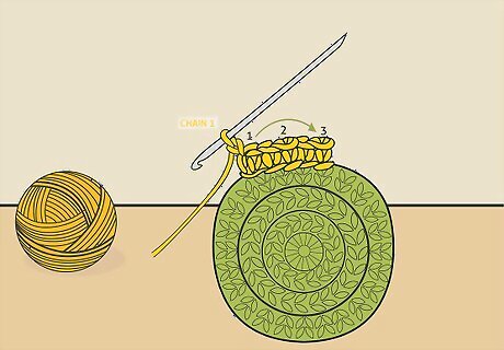 Chain 3 extending from the edge of the ring. Loop the yarn over the end of the crochet hook and pull this loop through the loop on the hook. Repeat this 2 more times to make a chain of 3.