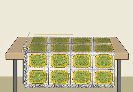 Sew the granny squares together. Thread a yarn needle. Then, tie the end of the yarn to the corner of 1 of the squares. Hold 2 squares together so that their flat edges are aligned on 1 side. Insert the needle through the corner stitches to connect the 2 squares together, then pull the thread taut. Repeat for the next stitch along this edge. Sew to the end of the edge of the 2 squares, and then repeat to sew another square onto the row. After you have all of the granny square rows completed, sew down the edges of 2 rows to connect them. Keep attaching rows until your blanket is all in 1 piece. Make sure the squares are all facing in the same direction when you sew them together. Use the same color yarn as the outer round of the squares or a contrasting color yarn, if you prefer.