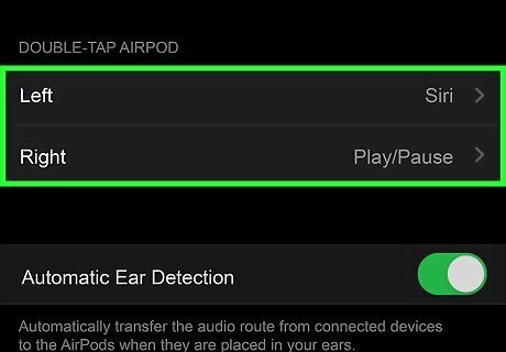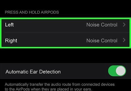 Tap Left or Right under "Press and Hold AirPods." You'll then see a drop-down menu of all your options you can use for that AirPod's button. You can select to activate Siri on one ear while the other AirPod cycles through noise control modes.