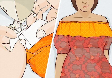 Cut the braided elastic and push it through the top ruffled piece. Wrap ⁄4 inch (0.64 cm) wide braided elastic around your shoulders where the top of the blouse will fall and add ⁄2 inch (1.3 cm) to the measurement. Cut the braided elastic and hook a safety pin onto 1 end so you can feed it through the gap in the ruffled piece. When it reaches the end, remove the safety pin and sew the 2 ends of elastic together. Keep the elastic flat as you feed it through the top.