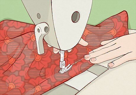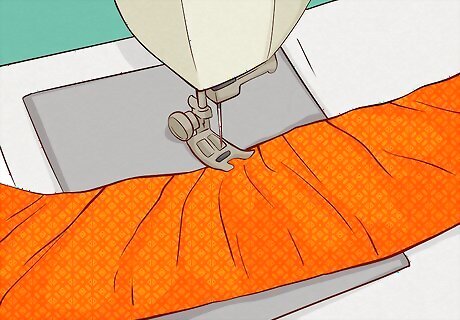 Stitch the short ends of the ruffled pieces and hem the long ends. Stack the rectangles together so the patterned side is facing in and pin along the short ends. Use the sewing machine to straight stitch the short ends together. Then, hem the bottom ⁄2 inch (1.3 cm) of the piece. You don't need to hem the top of the rectangle yet because you'll be sewing in the elastic band.