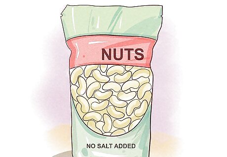 Buy plain unsalted nuts. Nuts are a delicious, healthy snack and a common pantry item. However, many nuts are covered in salt. Replace your salted peanuts, almonds, and mixed nuts with unsalted varieties. You still get delicious flavor without all the unnecessary salt.
