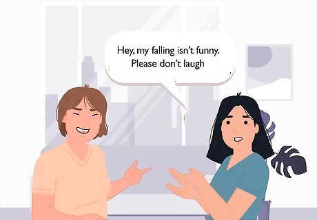 Be clear with your friends if you don’t like joking a certain way. Everyone has a different sense of humor. Your friends may have been being light-hearted, but something that was said or done rubbed you the wrong way. If this behavior makes you feel bad about yourself, you need to speak up. For example, if you do not like this friend laughing at you when you fall down, say “Hey, my falling isn’t funny. Please don’t laugh.” If you feel uncomfortable with him or her making jokes that go against your own morals like those that are based on race, make it clear you will walk away from that type of joke and do exactly that.