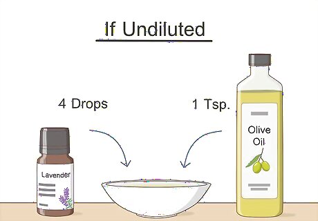 Dilute the oil to 3% if it’s undiluted. Never use undiluted oils on your skin because this can cause irritation. If the oil is undiluted, squeeze 4 oil drops into a teaspoon of olive oil for a 3% dilution. You can also use a different carrier oil to dilute the oil, like jojoba.