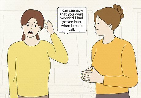 Repeat back to them the main ideas of their argument. If you can tell them in a cooperative and calm way what they said, it could help your parents trust that you understand them. This is especially true if you can show your parents how what they are saying connects to the bigger picture. Most importantly, it lets you take control of the conversation, re-framing their concerns in a personal light. "I can see now that you were worried I had gotten hurt when I didn't call." "I know that you're worried I might not have enough time to finish my homework." "I realize that you're only upset because you love me and want the best for me."