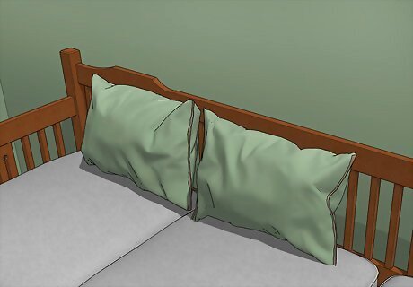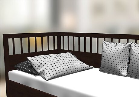 Add a sleeping pillow and decorative throw pillows to the head of the bed. Keep your daybed light by adding a single large pillow at the head of the bed. Then, stack 2-3 throw pillows in different patterns and textures in front of the primary pillow. A few well-placed throw pillows can brighten up the room without overcrowding the bed. Adding a few throw pillows is great, but try not to add too many. More than about 2 rows of pillows at the head of the daybed can make the space look small and cluttered. They can also be a hassle for you or your guests to remove every night and replace every day.