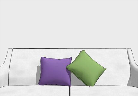 Choose 1 bold accent color to set off white walls. White walls can be overwhelming, especially if there is not much color in the room or if you have chosen a neutral palette for the rest of the room. Select a couple of objects in the same bright color and place them at opposite ends of the room, or place 1 in the center and 1 on the side of the room. For purple accents in the bedroom, you could put out a vase of purple irises on your bedside table and hang a small painting of an iris on the opposite wall. For a pop of yellow in the kitchen, place a bowl of lemons on a counter and a vase of yellow daffodils on the kitchen table. To add red accents to the living room, place a bright red ceramic sculpture on your bookshelf or coffee table, and toss a neatly folded, bright red throw blanket over the edge of the sofa. Metallics, such as gold, also make great accent colors. For example, you could place a gold bowl on a coffee table and a picture or mirror in a gold frame on the wall.